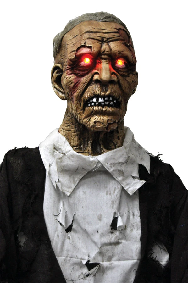 Vinyl old man head bust hair and shredded suit attached detailed hands attached to adjustable arms light-up LED eyes (requires 3 LR44 cell size batteries not included.) stand with pole construction armature. 62 inches tall.
