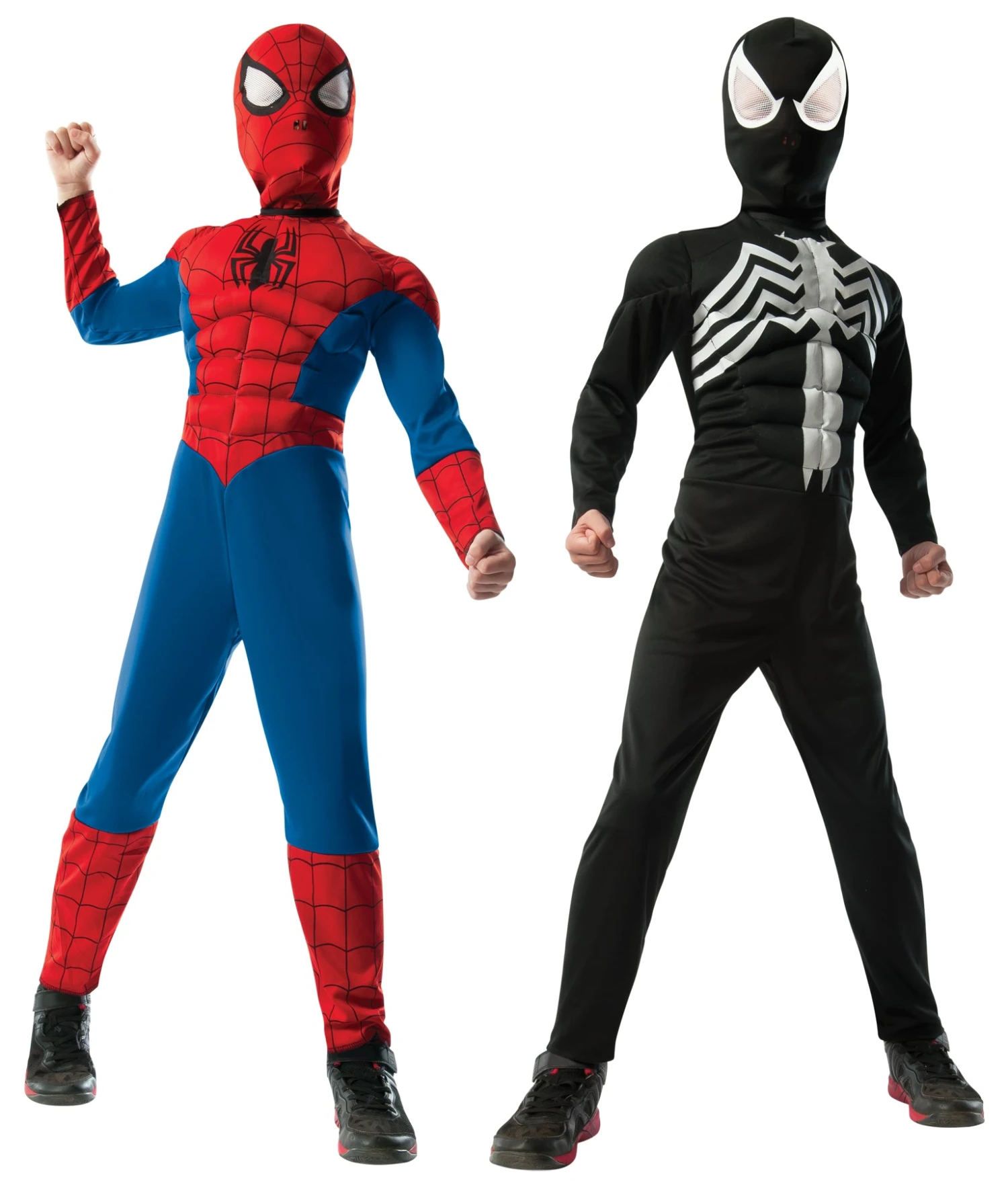 Be both hero and villain with this reversible deluxe superhero costume! One side of the padded jumpsuit is Spiderman with the blue and red spider emblem. Then let the venom symbiote take over and transform in Agent Venom with the black side of the padded jumpsuit and venom emblem. The reversible mask will conceal your identity on both costumes. 2017 Officially licensed Marvel product.