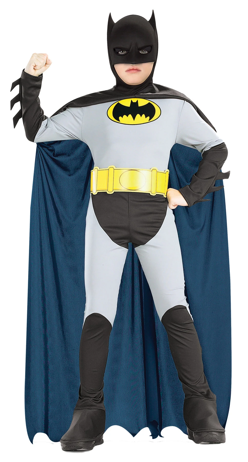 Your child can now be the Caped Crusader. Includes- Headpiece cape jumpsuit belt. Comic book version. Polyester. Small 4-6.
