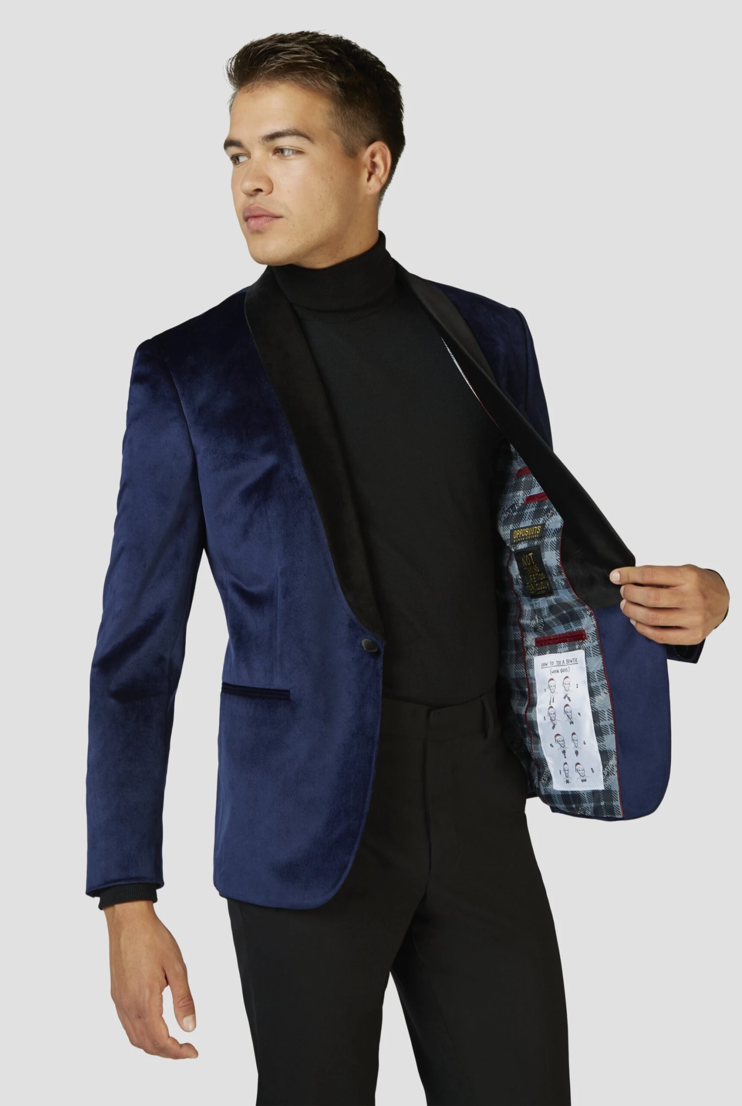 Sophisticated and stylish yet easy to wear; this deep blue velvet dinner jacket with a black shawl lapel is an item every gent should have in his wardrobe. The soft, smooth OppoSuits Deluxe item is your best friend during the entire holiday season (and beyond – it’s timeless).