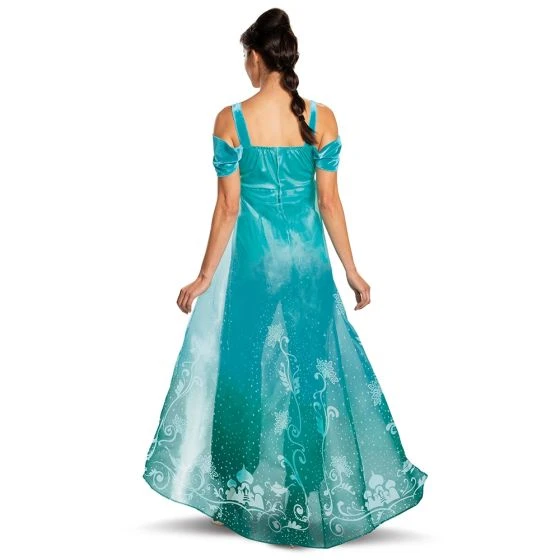 Beautiful teal satiny stretch jumpsuit has an attached sheer cape-like overlay with a fairytale print around the hemline. Just elegant! Plus Sizes AvailableÂ