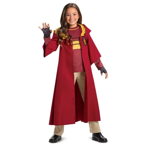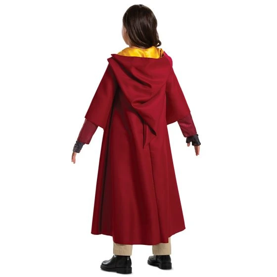 You’ll be the new star for Hogwarts School of Witchcraft and Wizardry when dressed in this fantastic Deluxe Quidditch Robe. Take to the sky and capture the golden snitch as part of the Gryffindor Quidditch Team. Grab your magical broomstick and enter a world of magic. The Harry Potter Quidditch Gryffindor Deluxe Child Costume features a red robe with Gryffindor Crest Patch, red and yellow striped shirt and a pair of brown fingerless gloves. Pants and shoes are not included.