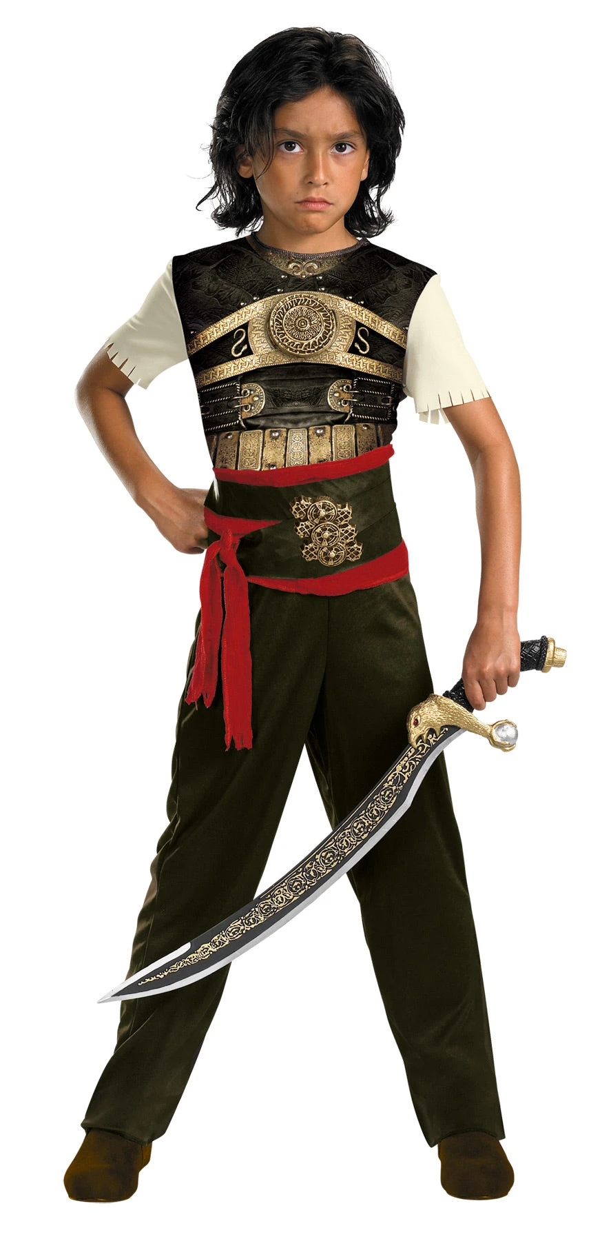Classic costume has a decorative top with attached belt and sash, detachable chest emblem, belt buckle and pants. Toy weapons are not included.