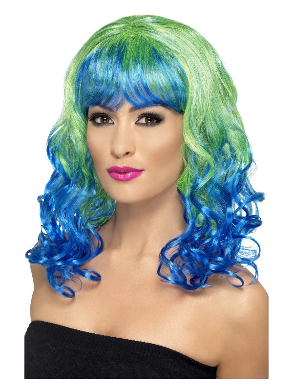 Divatastic Wig, Curly, Green & Blue, with Blue Fringe. Enhance your fancy dress costume with the Divatastic Wig. The green and blue wig comes with a fringe. You’ll definitely attract attention at the party!.