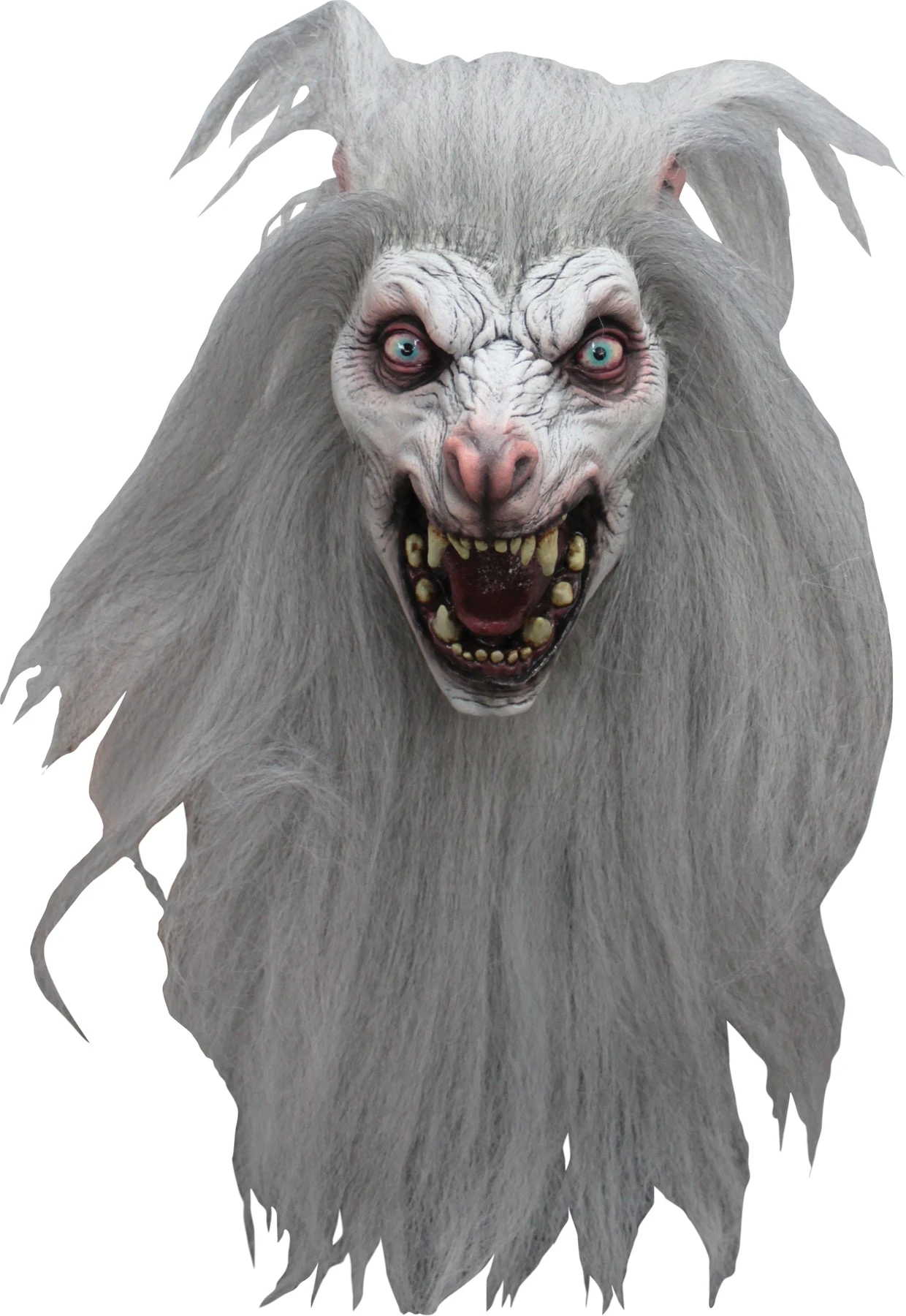 Intense looking werewolf creature mask with white hair attached for that extra realism. 100% latex. Individually hand painted for the best look. Full over-the-head mask. One size fits most adults.