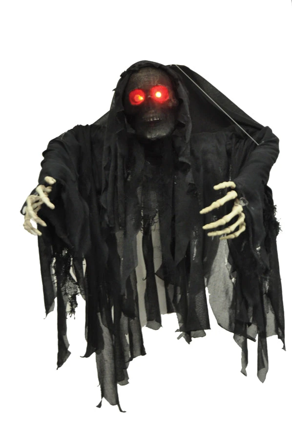 Grim reaper style hanging ghoul with black draped skull adjustable arms with detailed skeletal hands attached light-up LED eyes (requires 3 LR44 cell size batteries not included.) with dangling cloth costume. 21 inches long.