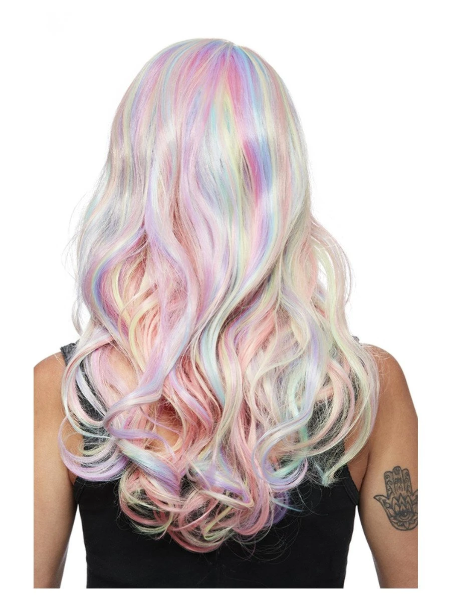 Manic Panic® Unicorn Dream™ Queen Bitch Wig, Long Drop Curls with Side Parting, Heat Styleable Multicoloured Pastel Wavy Long