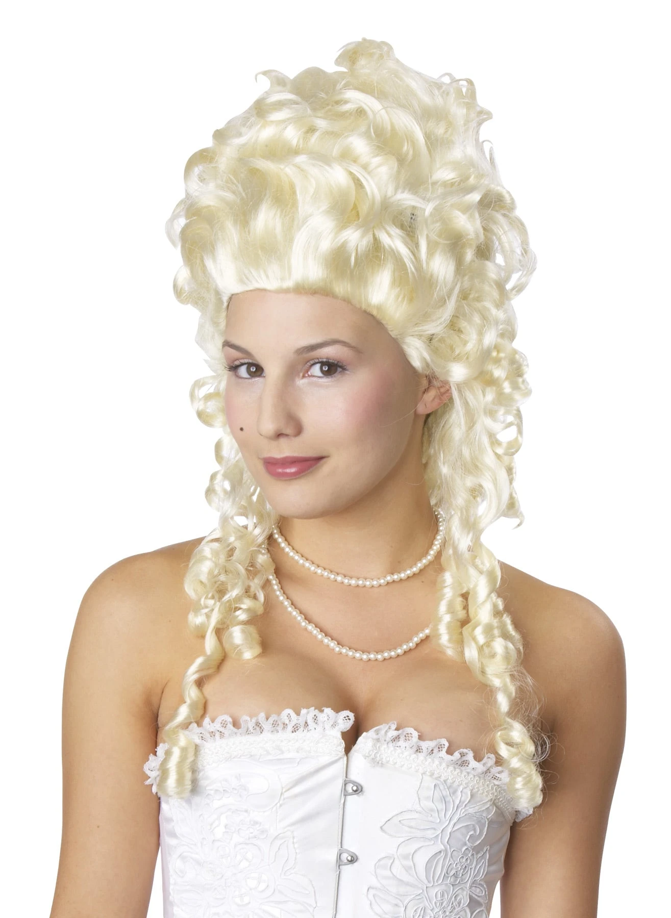 Traditional tall blonde wig with long curly sides.