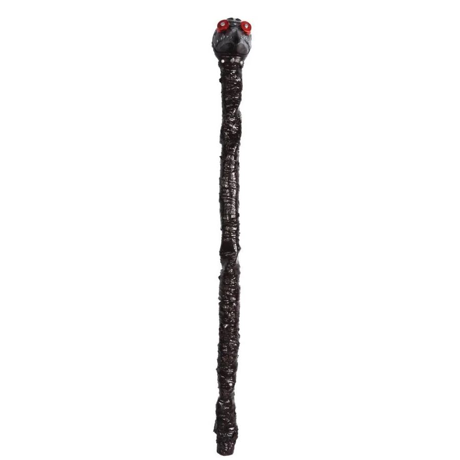 Calling all steampunks and steampunk-inspired cosplayers, this cane strikes the perfect balance between fear, fantasy and functionality. 47 inches long, this staff has a brown, rough look as if wrapped unevenly in electrical tape with crow’s head at the top, looking like it has a leather mask over top with metal stud look holding it on and goggles over the crows eyes. Quite an interesting look for a functional staff which can support weight of average person for actual use. Has wooden center and soft, squeezable top for easy gripping.