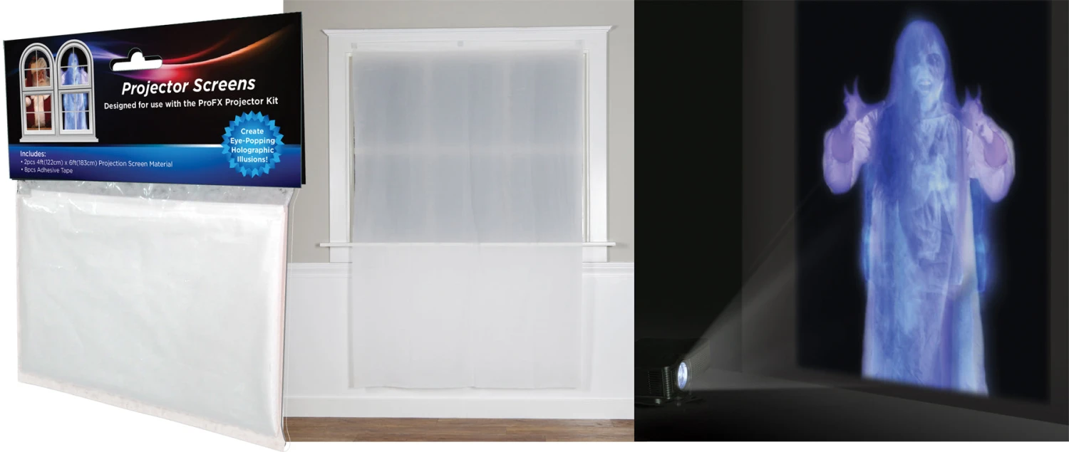 These white projector screens provide a great backdrop to show the images projected from the ProFX Projector! The white makes the projections pop for a super creepy effect! Each pack includes two lightweight 48 inches x 72 inches PEV (polyethylene vinyl acetate) screen sheets and includes 8 (1.18 inches square) EVA (ethylene vinyl acetate) adhesive t for easy set up.