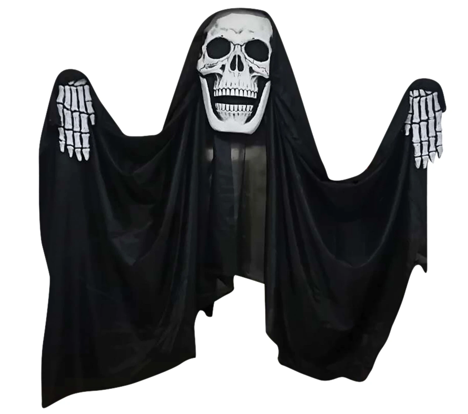 Haunting Reaper Curtain decoration is cloaked in a lengthy black robe that drapes down off its lifeless body! Place it above windows to use as a curtain or hang above doors and entryways to section off rooms. The robe drapes over 9 feet tall and is suitable for large as well as small spaces. Try it out for yourself and transform your space with an undead nightmare!