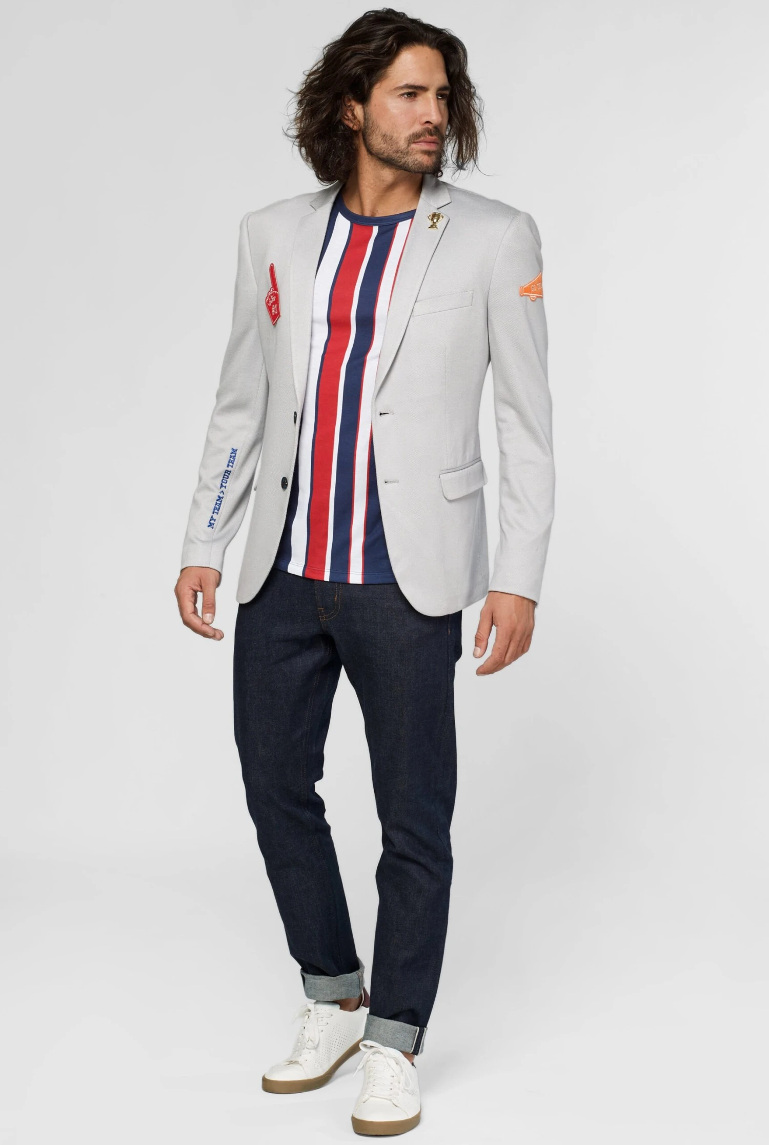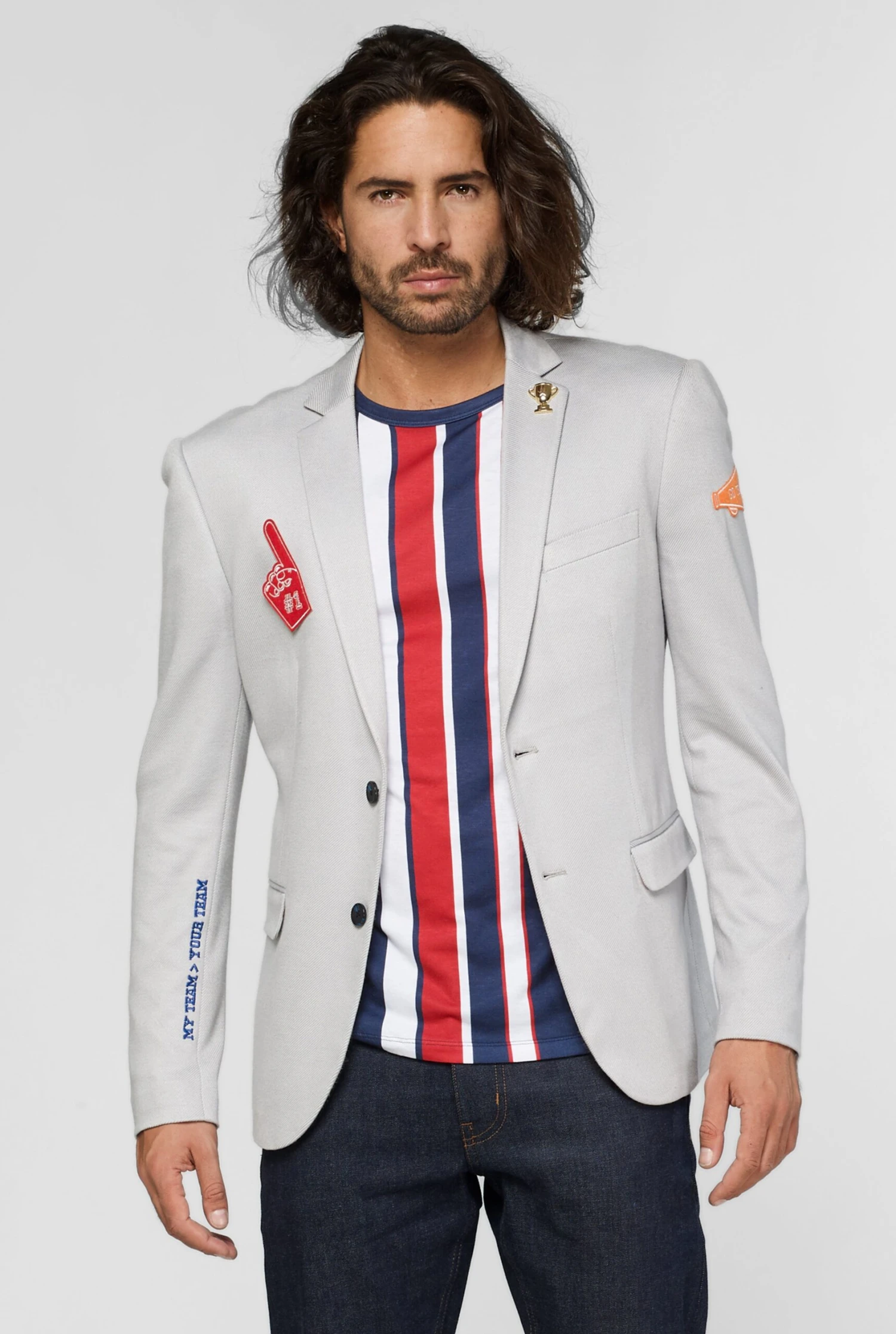 We thought the world deserved a stylish clothing option for supporting our favorite sports teams in style. That’s why we’ve designed this Sports Jersey blazer with an ultimate sports events lining: fast food. The OppoSuits Deluxe blazer has a soft grey color and features a shoulder patch, two detachable pins and an embroidered, innocent dis on the right sleeve to get everyone in the competitive mode.