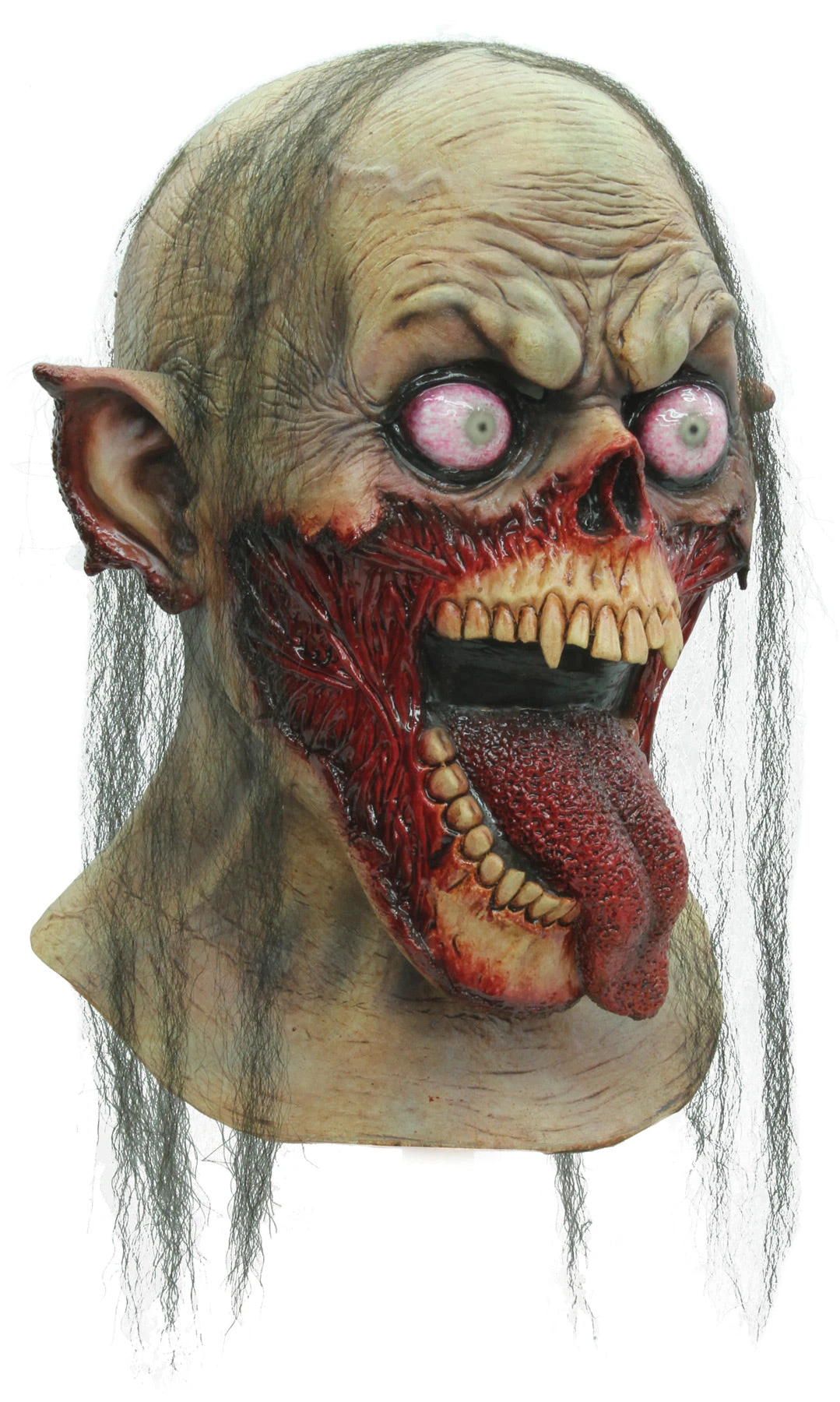 Totally deranged, mouth agape with tongue hanging out. Full over-the-head latex mask. Individually hand painted for the most realistic look possible.