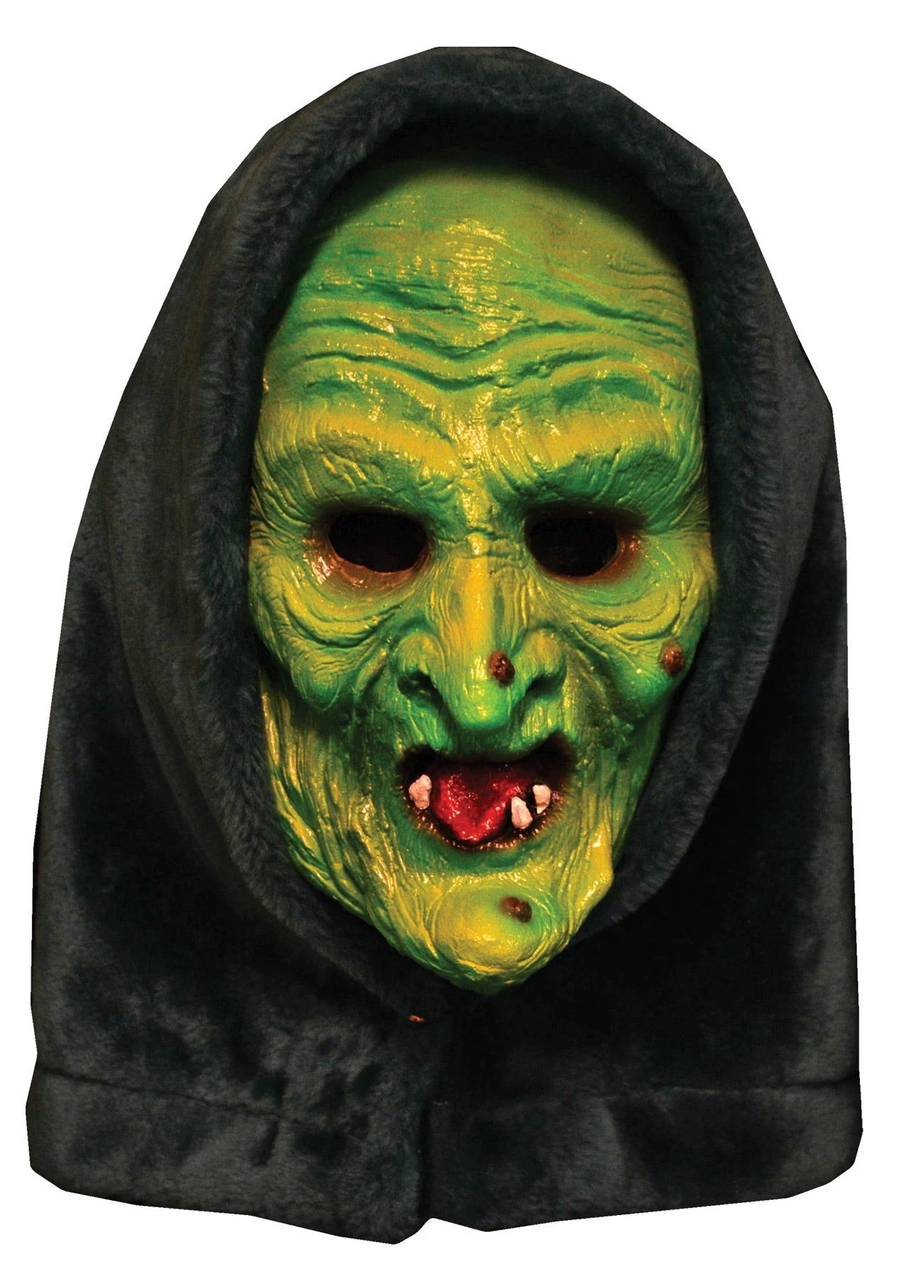 Green witch latex face mask attached to plush hood. Just like the one used in the film. One size fits most adults. witch mask.