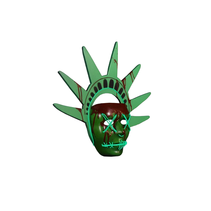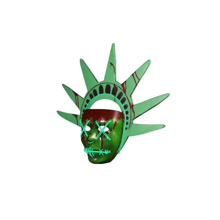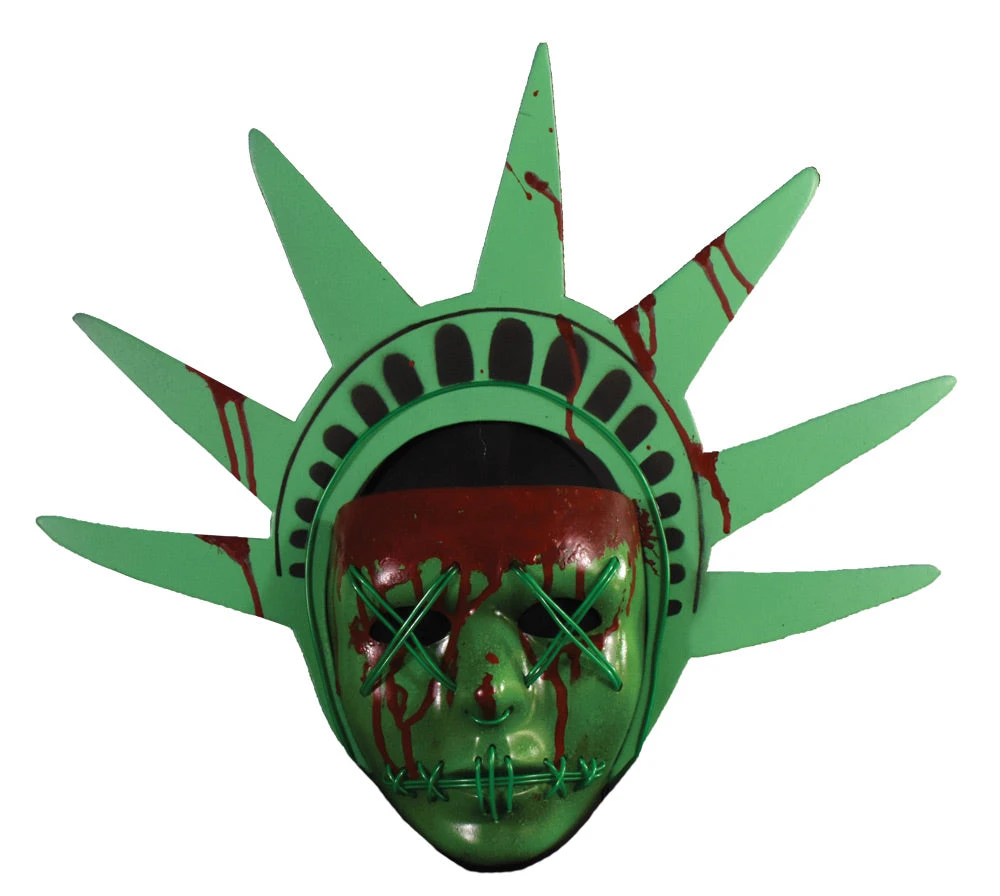 This amazing mask is a perfect version of the iconic mask worn the Lady Liberty Purger in The Purge: Election Year. Each mask comes with stitched Green LED Lights, a sturdy foam crown and AA battery pack with three flashing modes that can easily clip on to your pants or pocket. (Batteries Not Included).